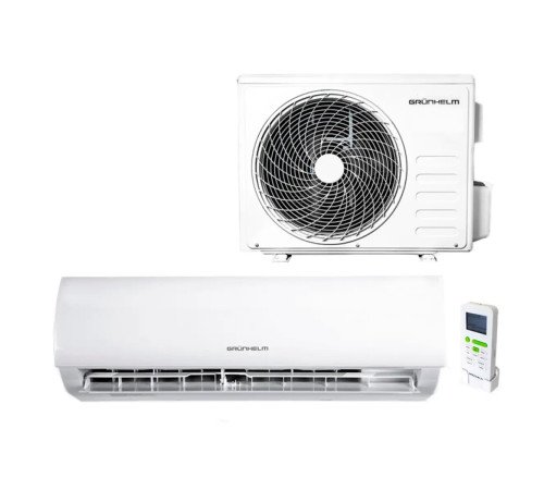 Кондиціонер по спліт-системі GRUNHELM GAC-07GH настінний та працює від роторного двигуна, який споживає 609 Вт при обігріві та 639 Вт при охолодженні (клас А). Керується пультом, яким можна встановити таймер або режим на електронному дисплеї. У даній системі встановлений якісний компресор GMCC, а довжина магістралі досягає 15 м. Кондиціонер може працювати в режимах охолодження, обігріву, вентилятора, автоматично, осушувати, ЕКО, турборежимі. Серед особливостей варто виділити рестарт, самоочищення, запам'ятовування налаштувань. Діапазон робочої температури +42/-7°С, потужність 7000 BTU. Ця модель рекомендована для площі 20 м².